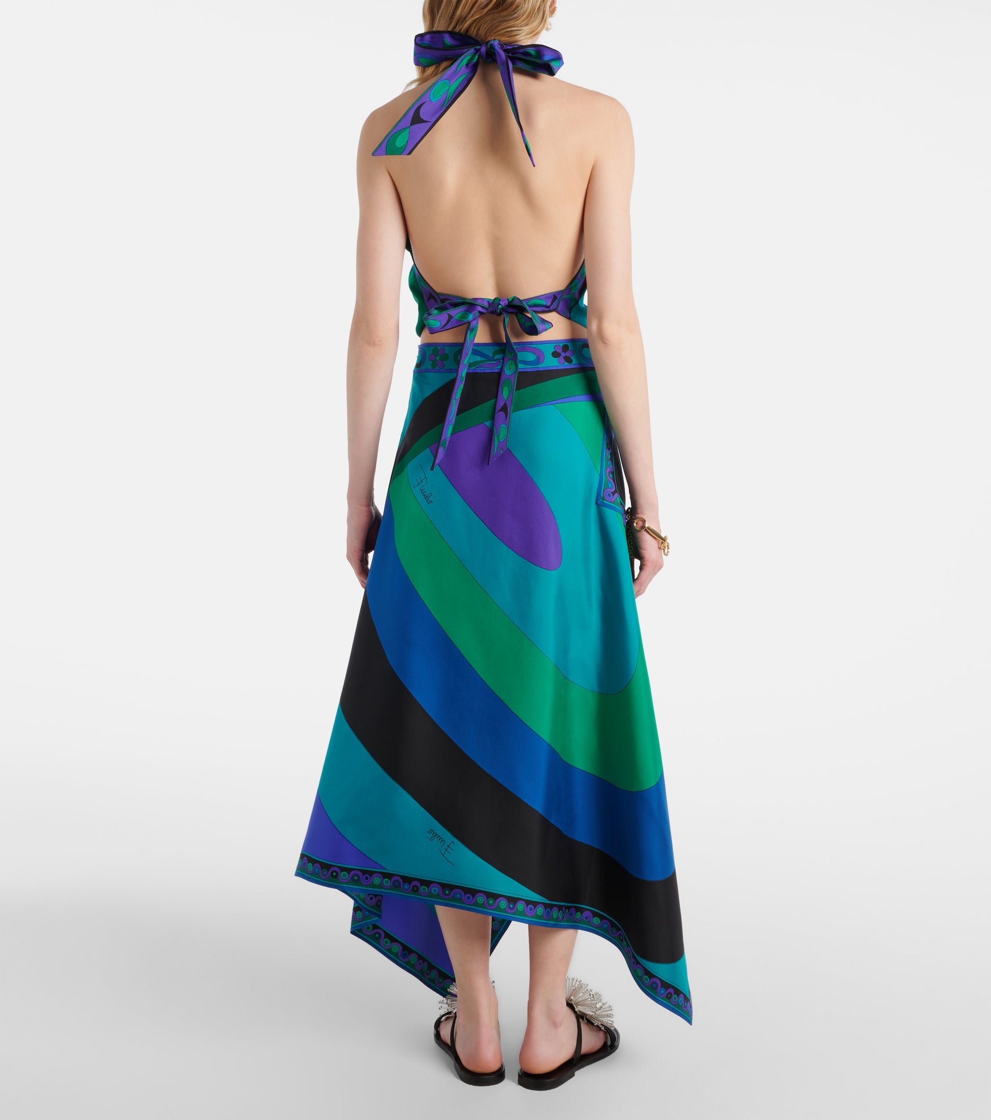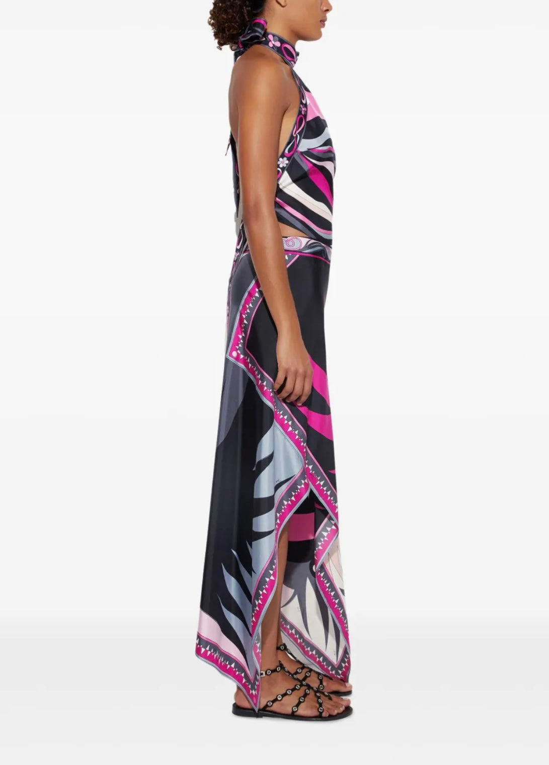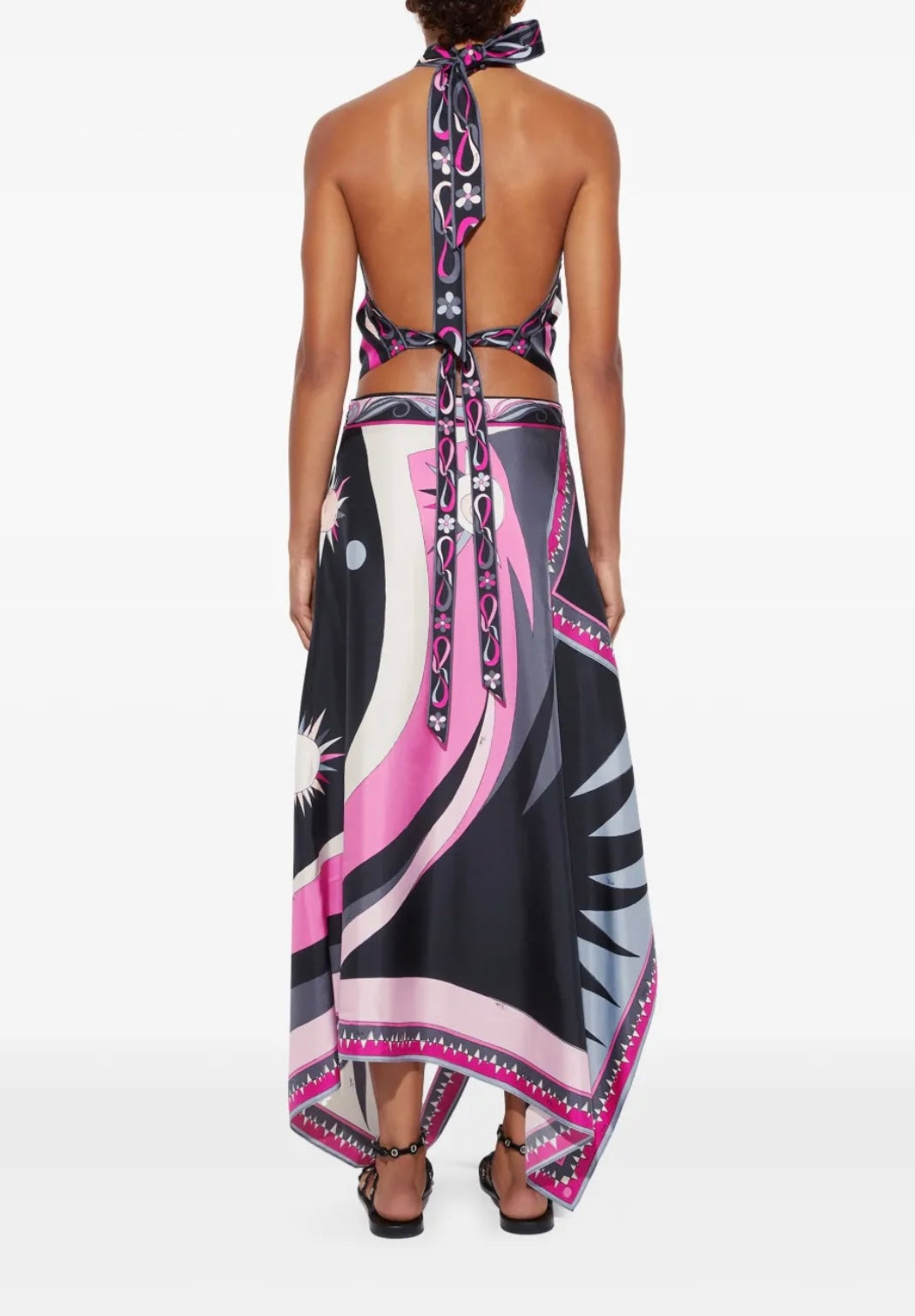 The matching high-waisted midi skirt mirrors the top’s asymmetric flair, creating a fluid, fashion-forward look that flatters every curve. Available in three dreamy shades, each version showcases a unique, vibrant print that captures the carefree spirit of summer.