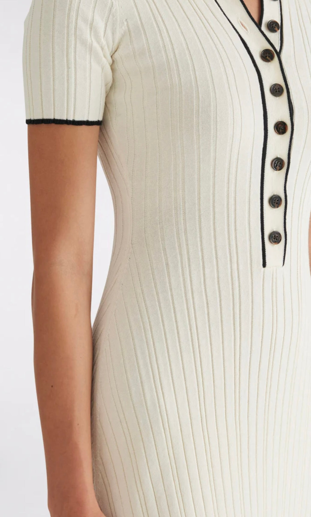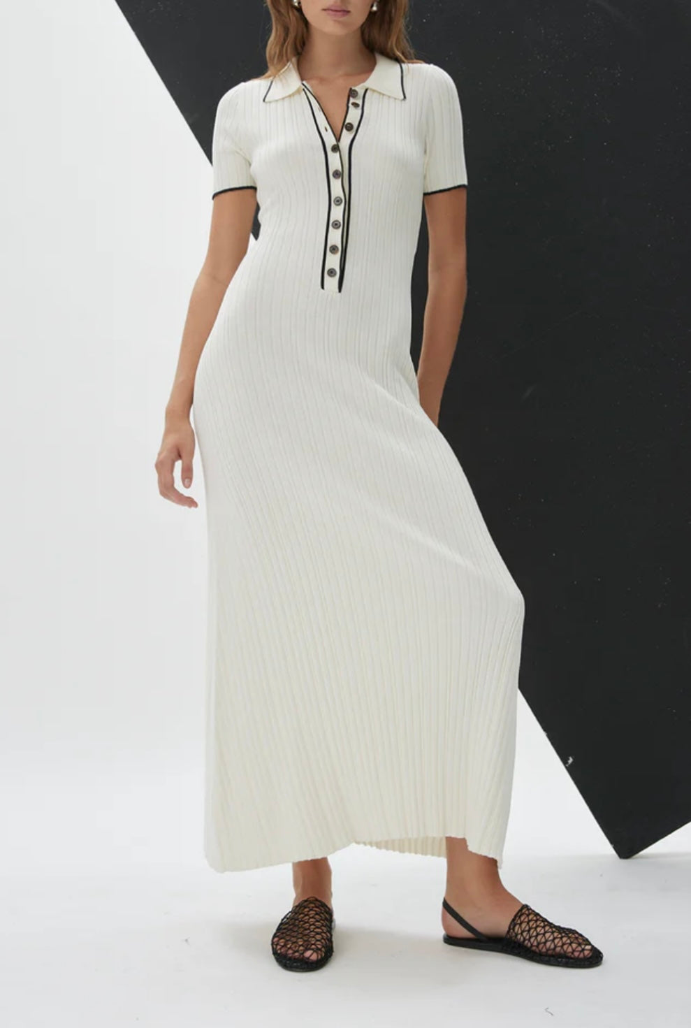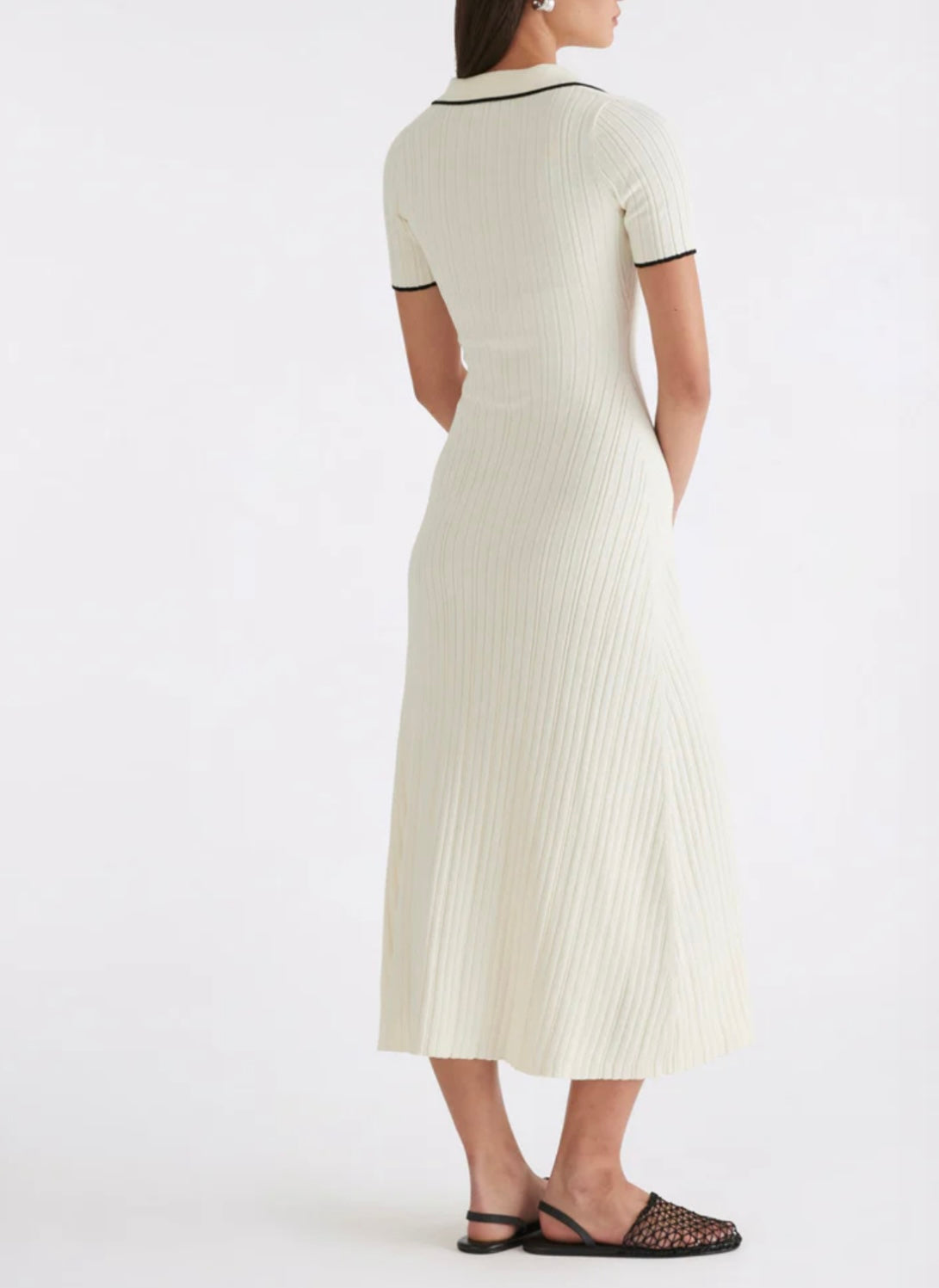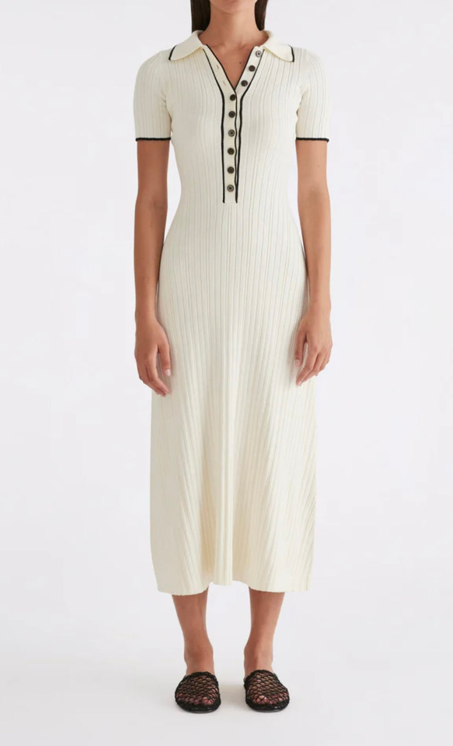 Timeless elegance meets effortless comfort in this rib-knit cotton midi dress. Designed with a classic polo neckline and adorned with contrasting buttons, this piece strikes the perfect balance between sophistication and ease. The soft, breathable cotton offers a flattering fit with natural stretch, making it an essential for both casual and polished looks.