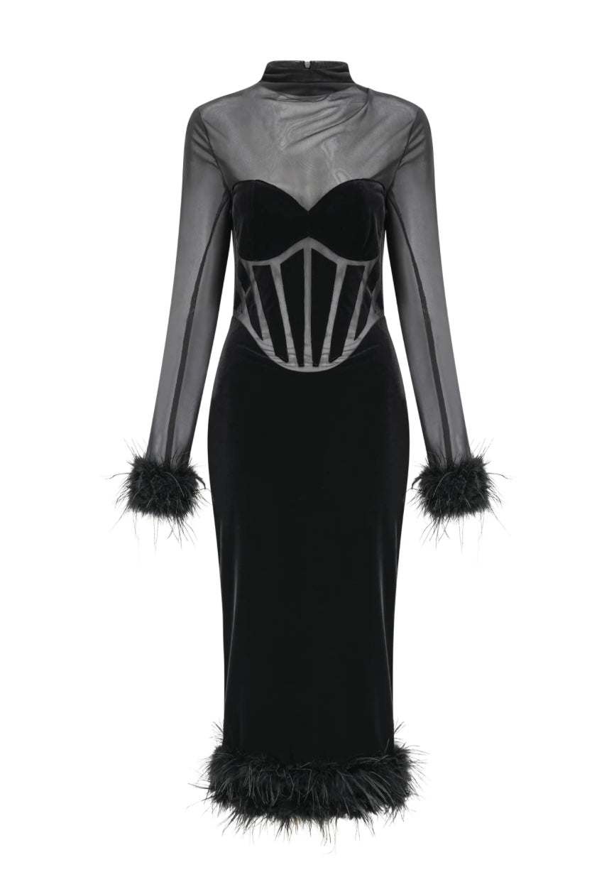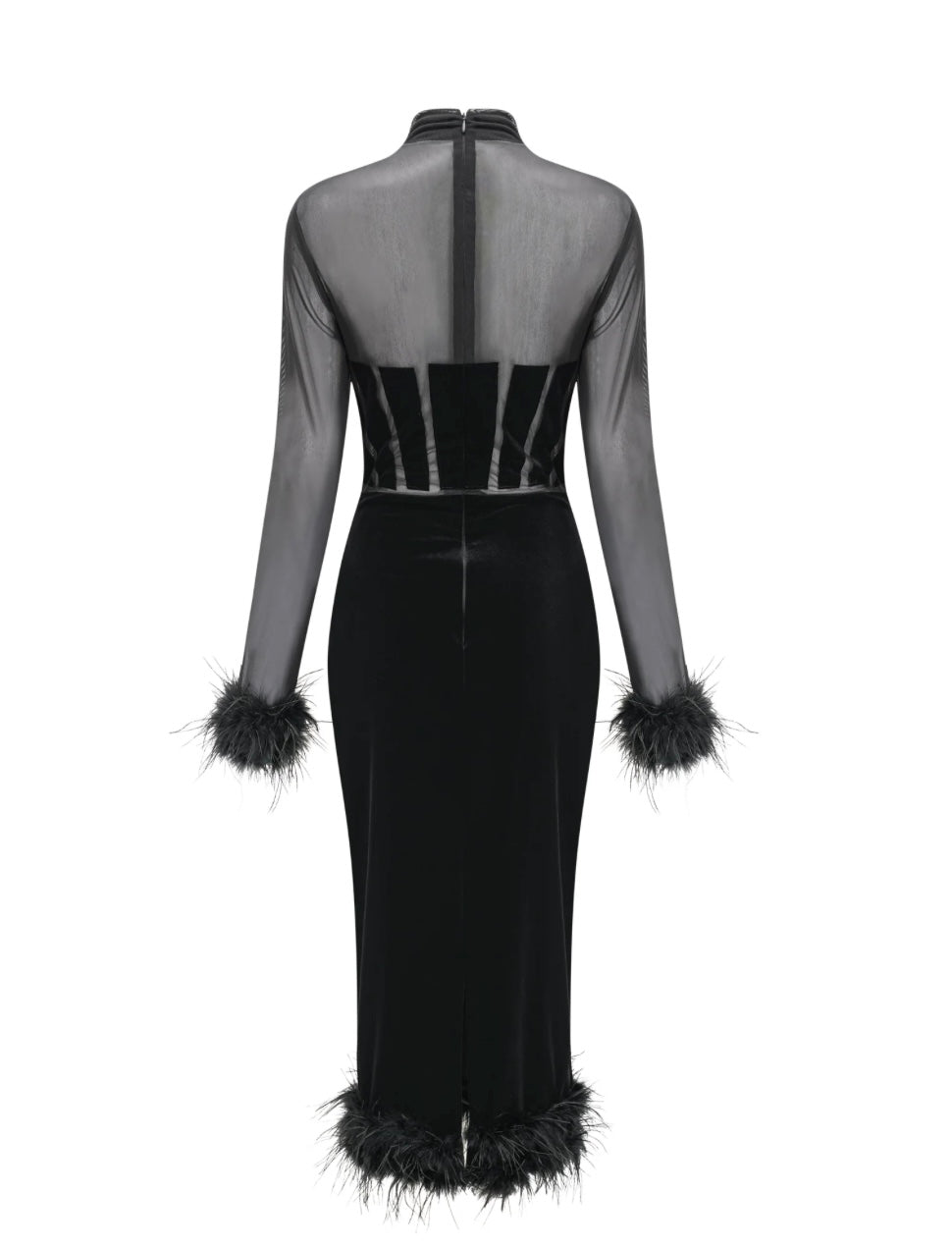 The mesh top and sleeves add a touch of sultry sophistication, perfectly balanced by luxurious feather details that grace the rim of the dress and cuffs of the sleeves. A back slit enhances movement and adds a subtle, flirtatious touch, while the discreet zipper ensures a seamless finish.