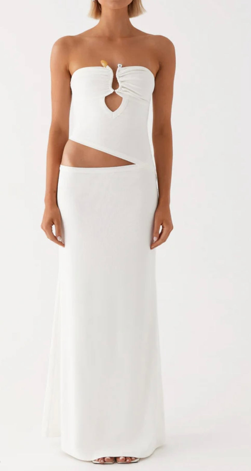 Turn heads with the Énigme Dress, a showstopping piece that combines luxury and allure. This strapless maxi is designed to captivate with its striking metal embellishment at the front, adding a touch of edgy glamour. Flattering binded cutouts along the front and sides reveal just the right amount of skin, while the jersey stretch fabric hugs your curves beautifully for a flawless silhouette.
