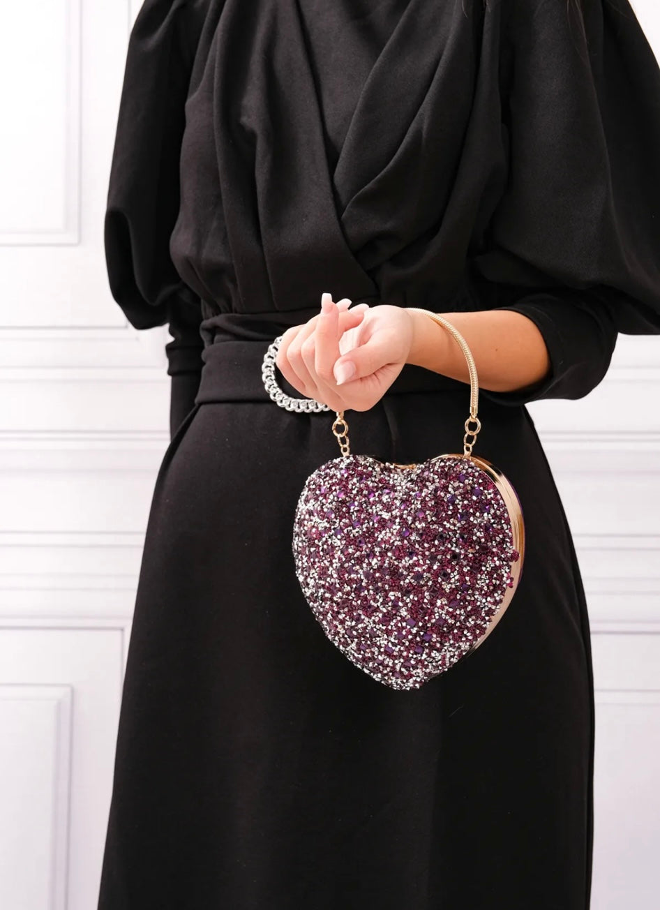 Add a touch of sparkle to your holiday season with this stunning heart-shaped clutch. Embellished with shimmering rhinestones and topped with a dazzling diamond-shaped closure, this bag is a show-stopper for any festive occasion. Designed with versatility in mind, it includes a detachable strap, allowing you to wear it as a crossbody, shoulder bag, or clutch. Perfect for adding elegance and charm to your evening look, this bag is your ultimate holiday accessory.