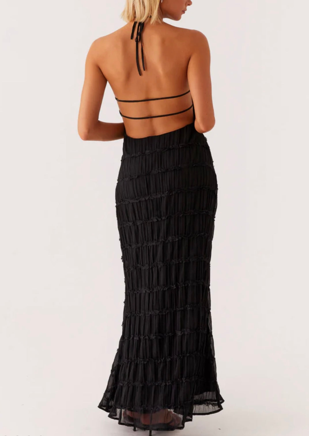 This dress is a timeless piece that exudes effortless elegance. Designed with a flattering halter neckline and an adjustable neck tie. The textured fabric adds dimension, while the fully lined silhouette ensures a smooth, graceful fit. Featuring a secure side hook-and-eye closure and an invisible zipper.