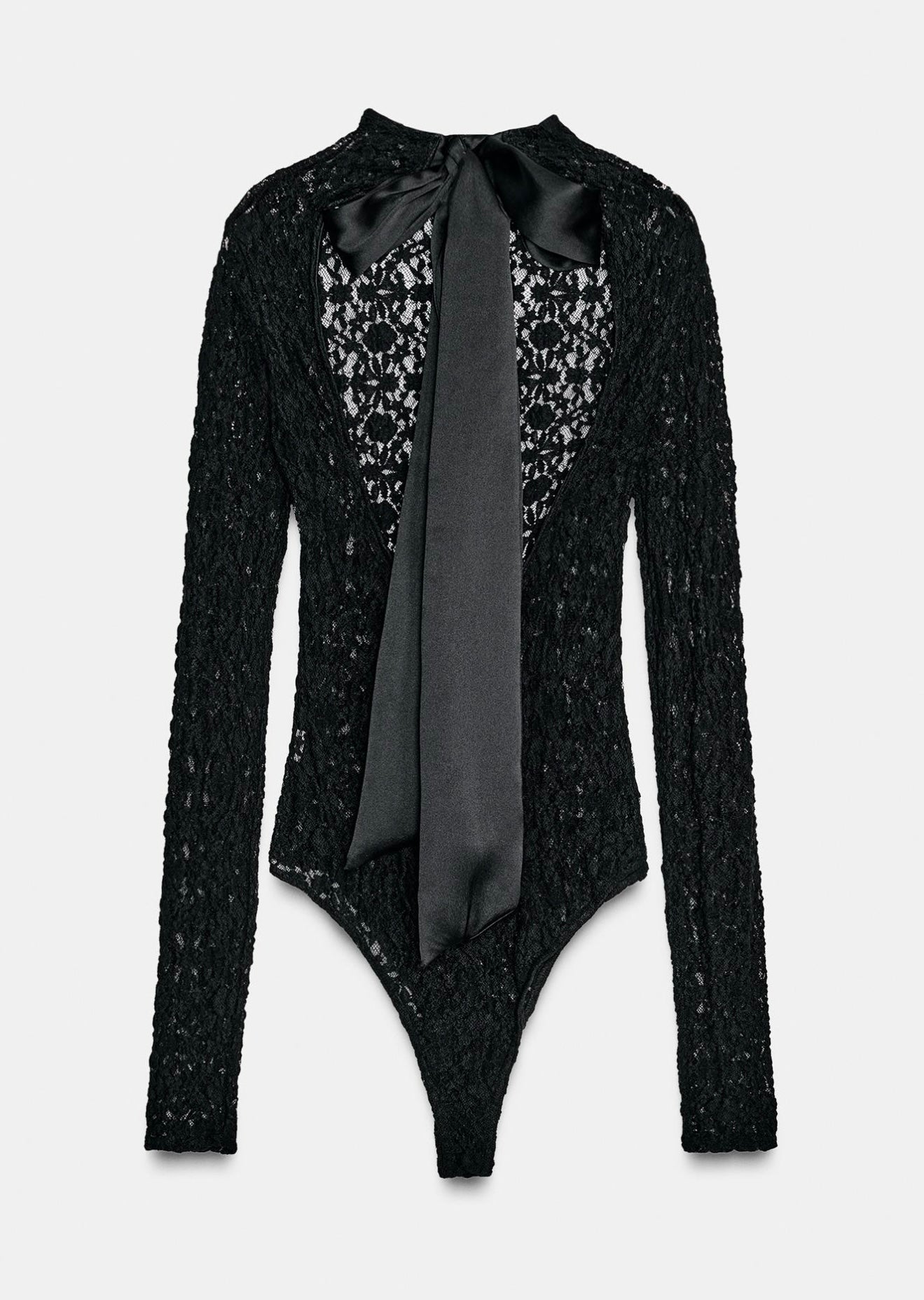 Der passende Body aus weichem, transparentem Spitzenstoff sorgt für einen sinnlichen und eleganten Look. Ein Druckknopfverschluss und die Satin Schleifen am Ausschnitt auf der Rückseite unterstreichen die feminine Silhouette und runden das Set stilvoll ab.