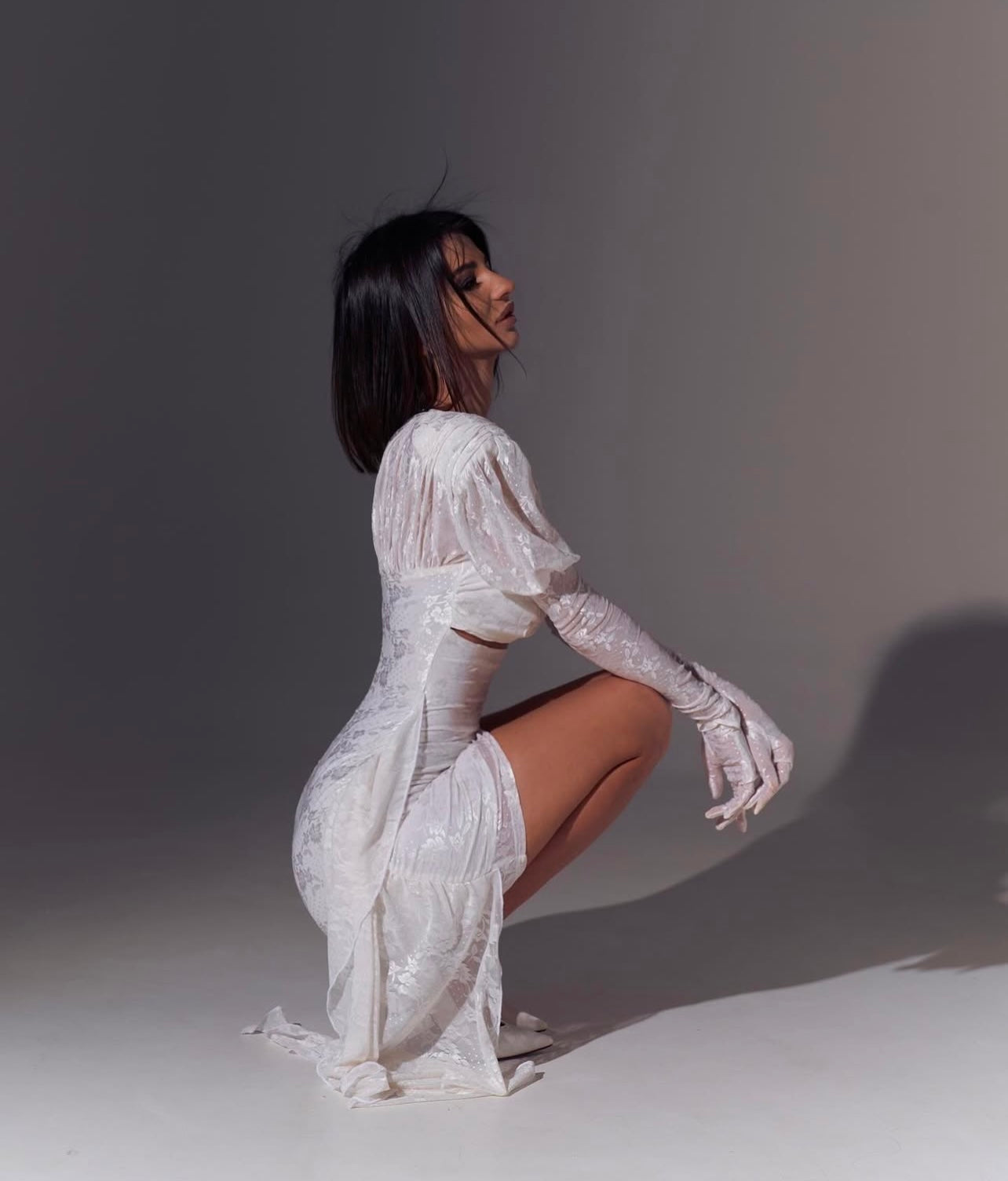 This exquisite Special Edition Dress, a masterpiece of elegance and sophistication. Crafted from beautiful, delicate lace, this dress is a celebration of timeless style with modern touches. Featuring long sleeves with integrated gloves, it offers a unique and refined look that’s both dramatic and glamorous. A pearl closure at the front adds a touch of luxury, while the back zipper ensures a flawless fit.