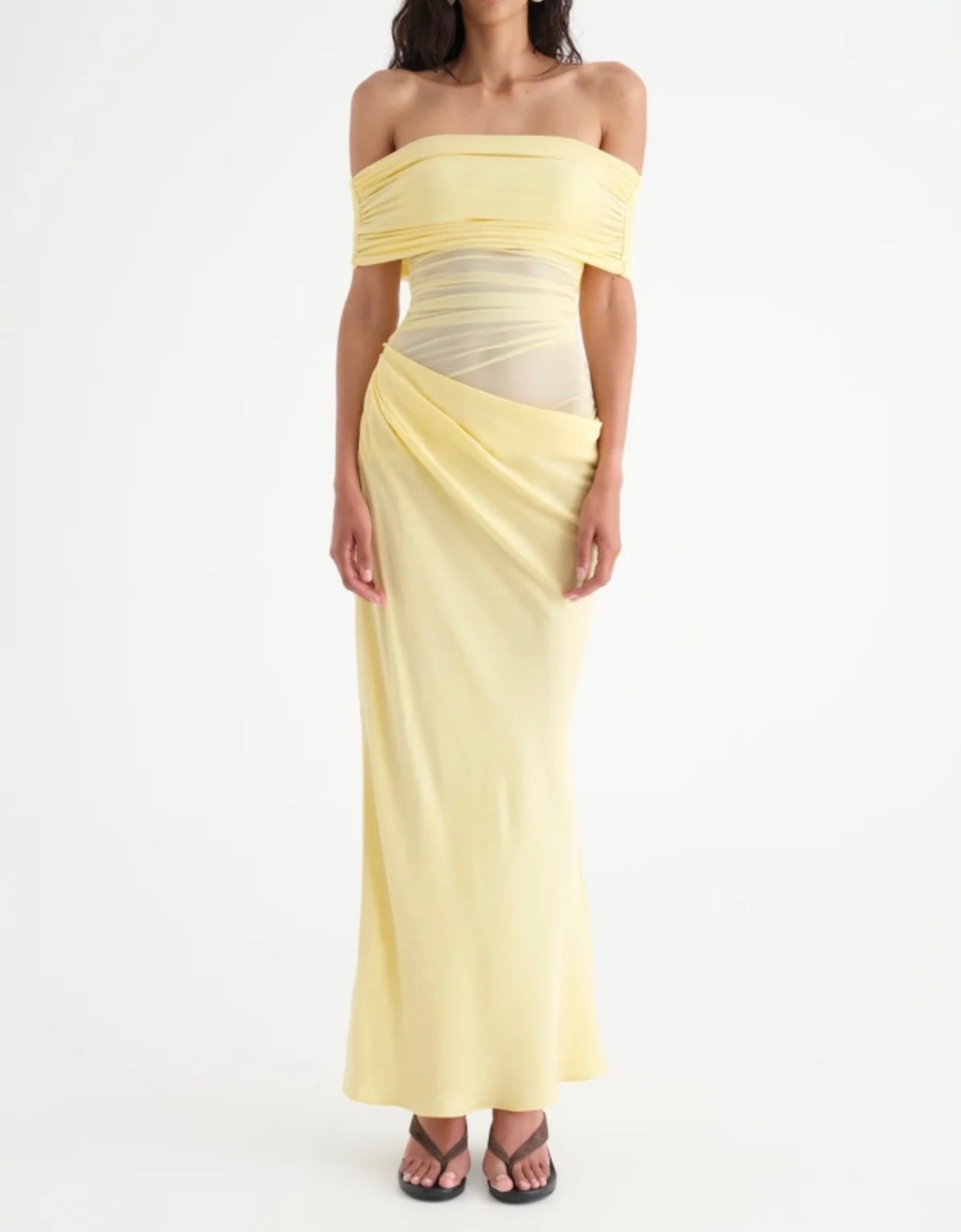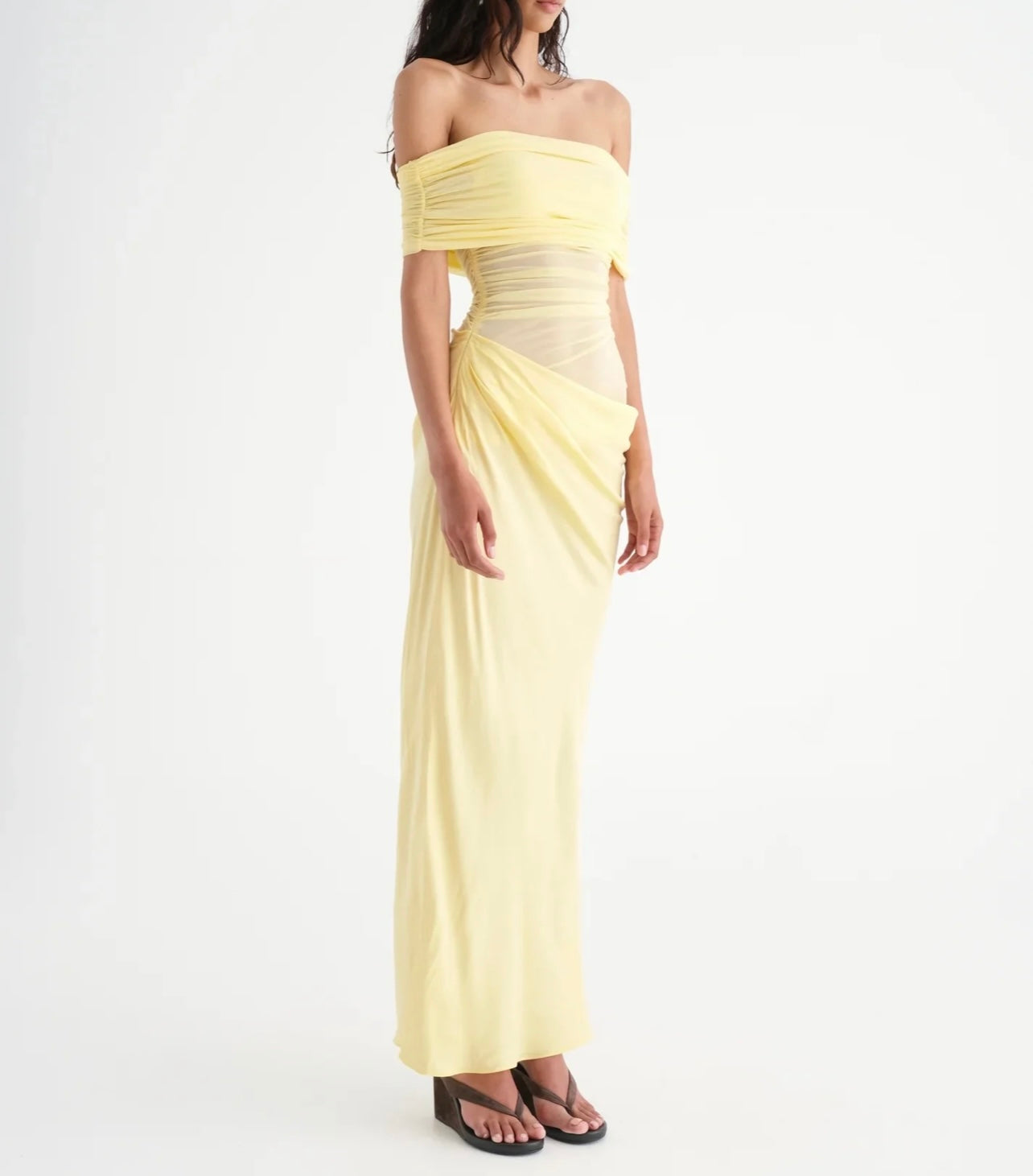 This off-shoulder dress is designed to make a statement, featuring a flattering cowl detail on the left waist and a unique overlapping skirt. The mesh bodice, with ample stretch, hugs the body for a form-fitting look, while the detachable skirt front and back adds an elegant touch. The generous cowl waist offers the option to show more skin on the left-hand side, creating a chic, modern silhouette. Perfect for those seeking a sophisticated dress for any occasion, it skims the body while offering both comfort and style.