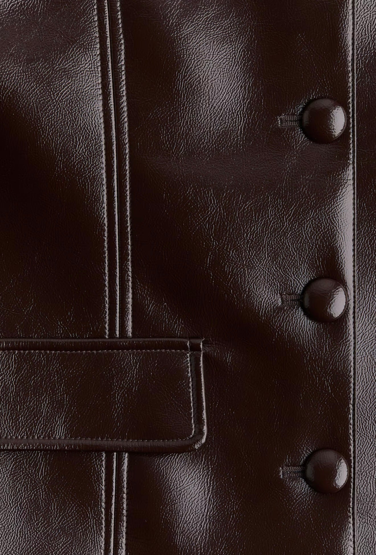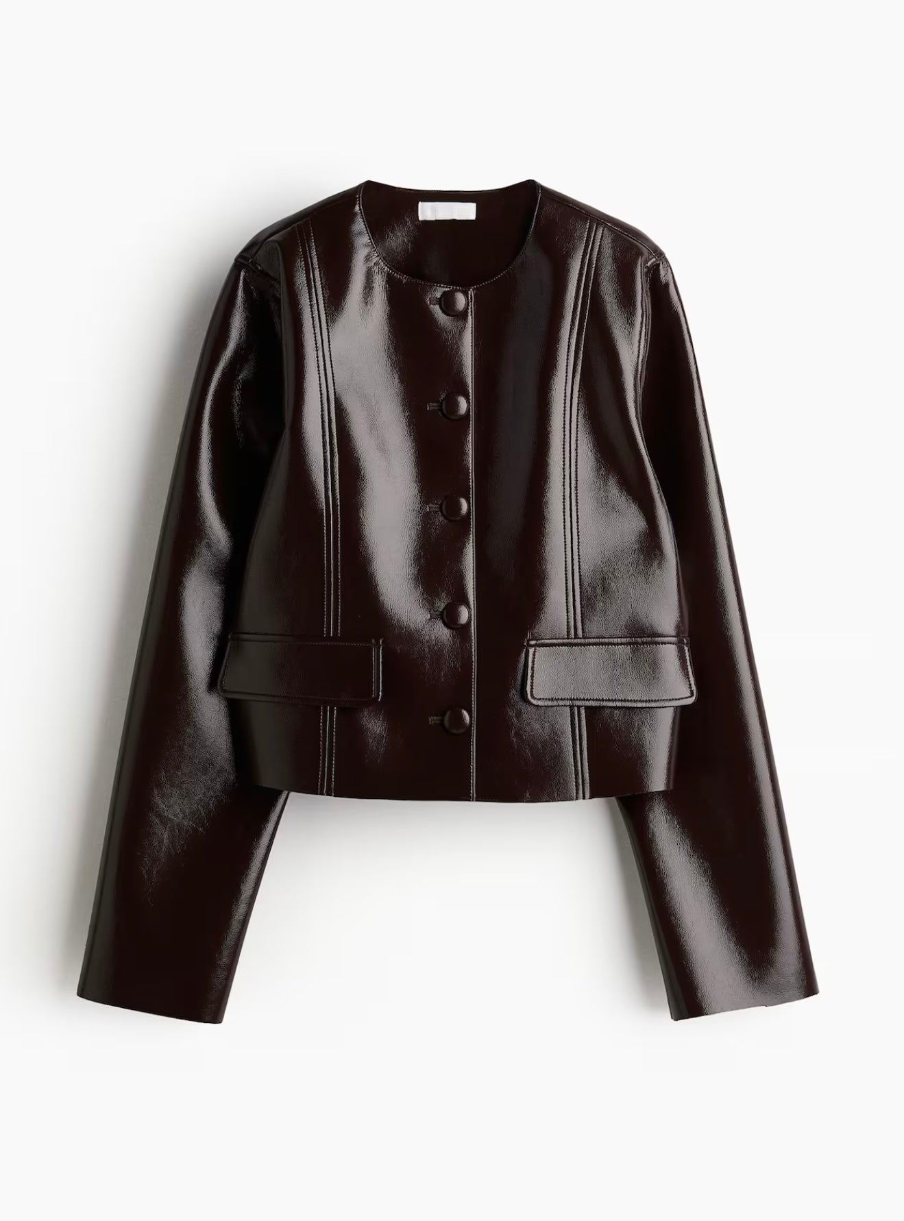 Diese stilvolle Jacke aus hochwertigem, beschichtetem Material überzeugt durch ihre moderne Struktur und ihren zeitlosen Chic. Der runde Halsausschnitt, die mit Stoff bezogenen Knöpfe auf der Vorderseite sowie die dekorativen Pattentaschen verleihen der Jacke eine edle, minimalistische Optik. Trotz ihres ungefütterten Designs bietet sie einen angenehmen Tragekomfort und eine klare, elegante Silhouette.