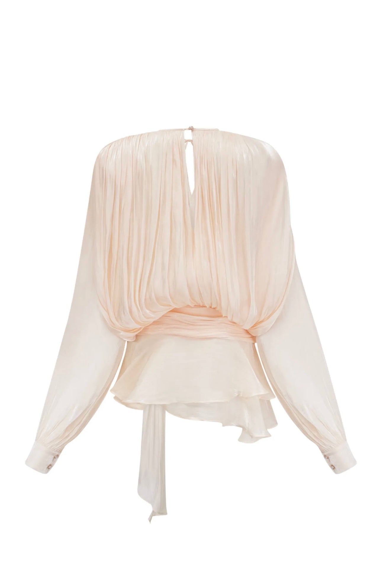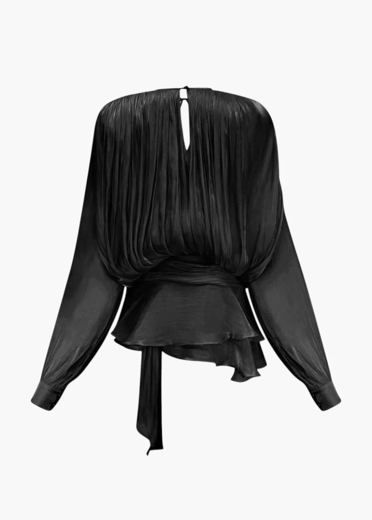 This statement mini dress blends sophistication with a bold, fashion forward edge. Featuring an twisted drape design that flatters the silhouette, structured shoulder pads for a powerful look, and a fully pleated ruffle hem that adds a touch of romance. The long sleeves with fitted cuffs exude timeless elegance, while the invisible side zipper closure and delicate pearl buttons complete the look with refined detail.