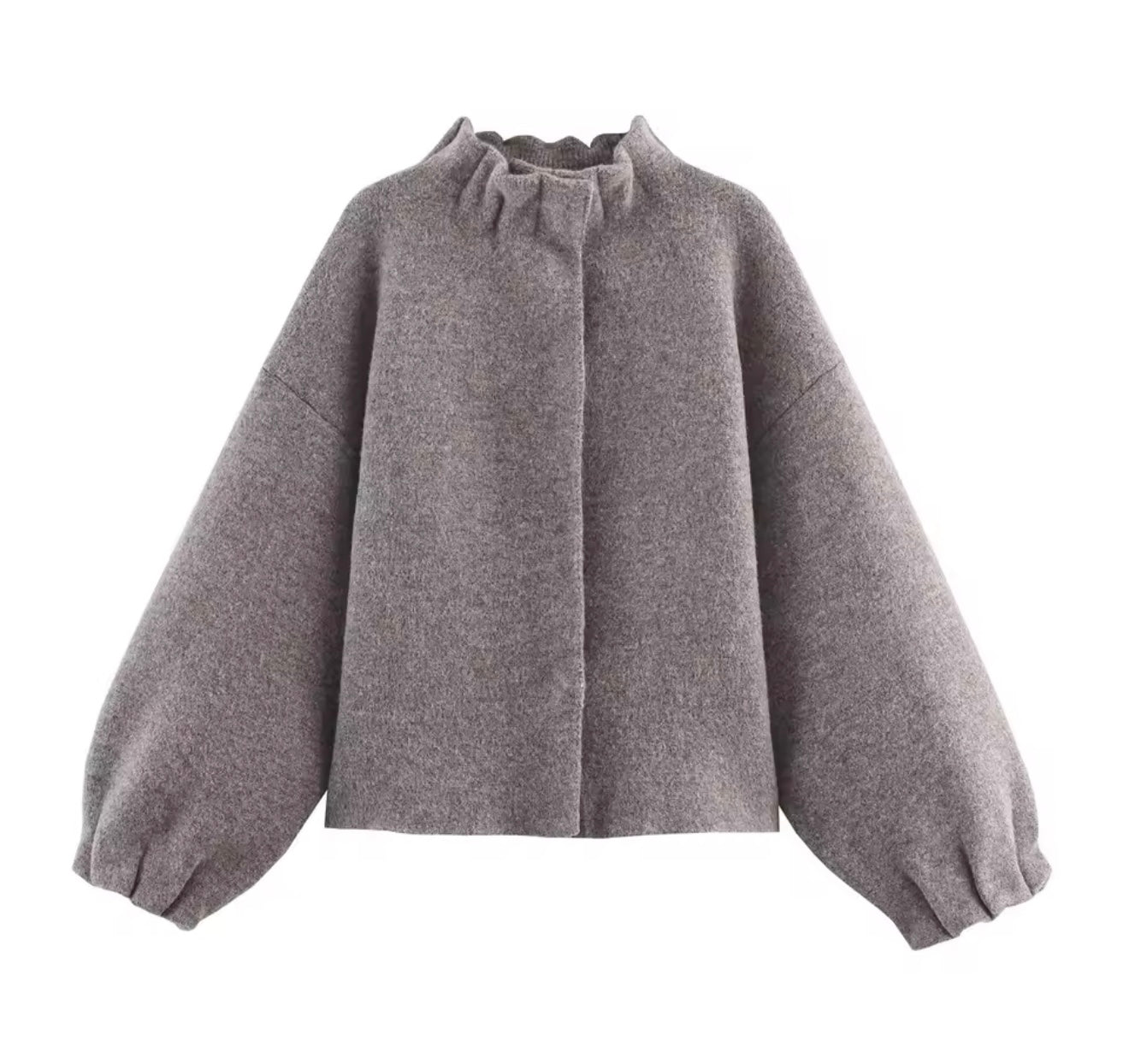 Dieses stilvolle veste überzeugt durch seinen modernen, minimalistischen Look und ist aus einem weichen, wärmenden Wollmischgewebe gefertigt, das optimalen Tragekomfort an kühleren Tagen bietet. Die lockere, leicht oversize Passform mit überschnittenen Schultern sorgt für einen lässigen Sitz, während die langen Ballonärmel mit elastischen Bündchen und der zarte Stehkragen mit Rüschendetail elegante Akzente setzen. Perfekt kombinierbar für einen schicken, aber gemütlichen Alltagslook – besonders schön in Kombination mit dem passenden Rock.