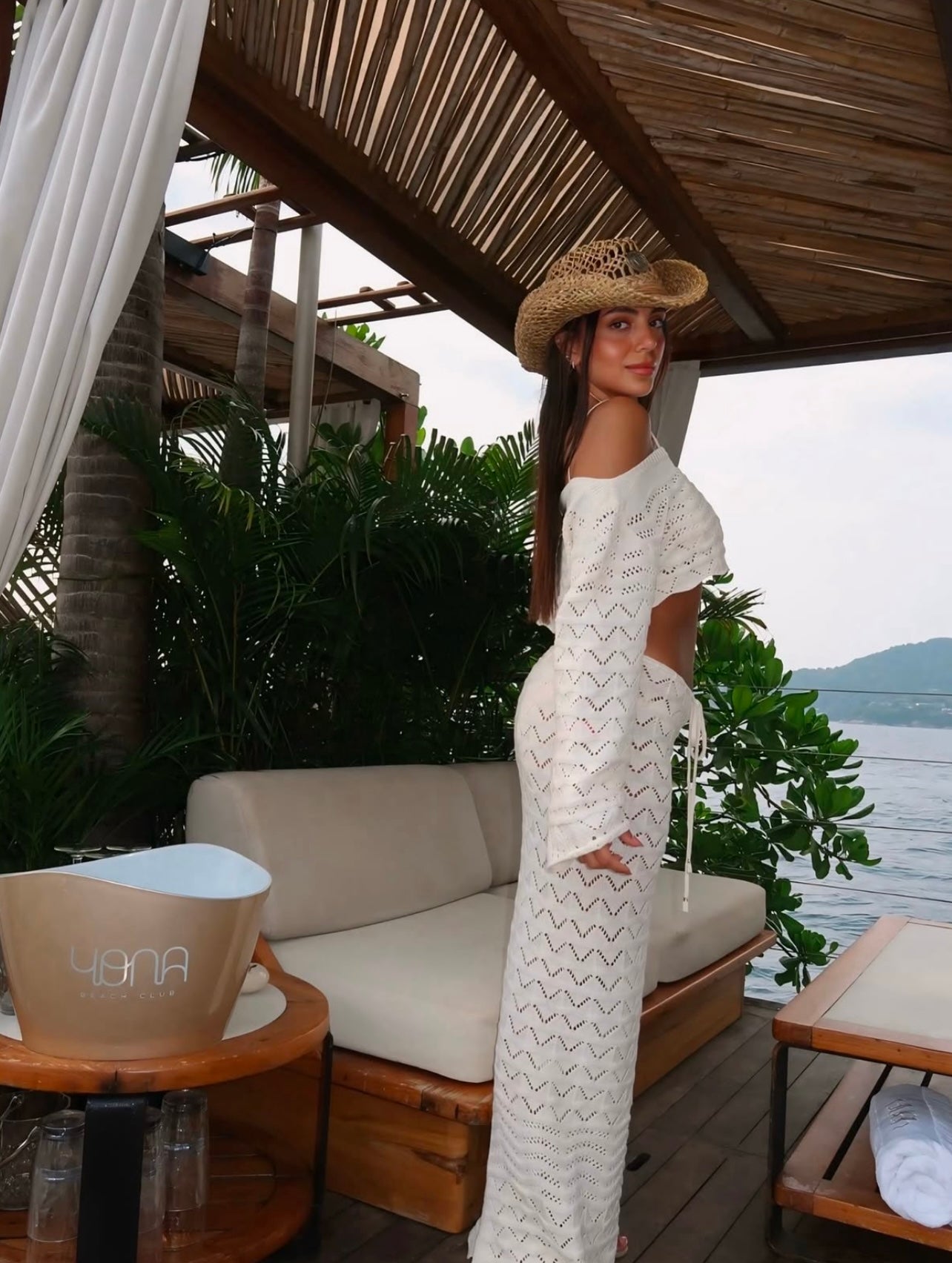 Opt for glamorous beachwear styles for your summer getaways. The Naya knit Set features a crochet knit top in an off shoulder, cropped silhouette, paired with a low rise maxi skirt in a fishnet style weave. The skirt ties at the waist with a delicate bow, creating a breezy, feminine look perfect for seaside moments.