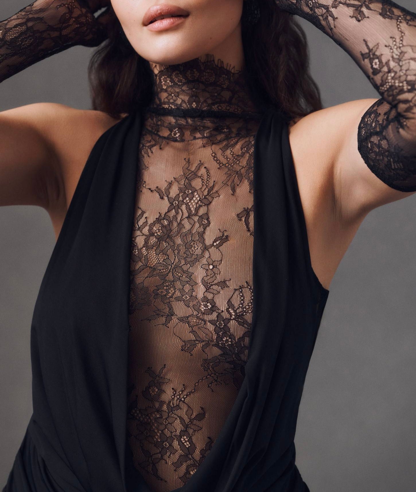 Der hohe Kragen mit einem kunstvoll drapierten Wasserfallausschnitt verleiht dem Kleid eine luxuriöse und zugleich moderne Note. Das taillierte Spitzenoberteil bringt einen Hauch von Romantik ins Spiel und sorgt für eine sinnliche, aber elegante Ausstrahlung.