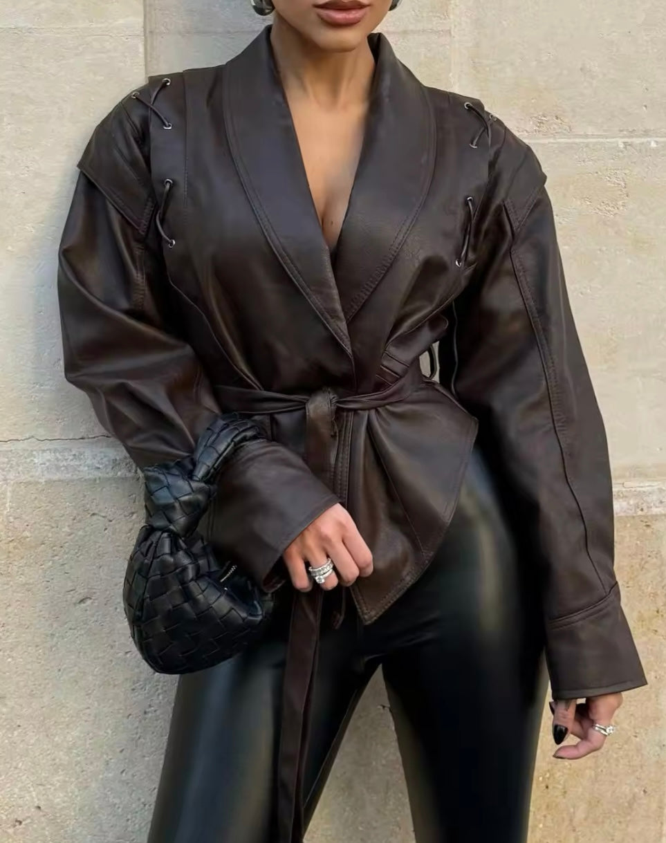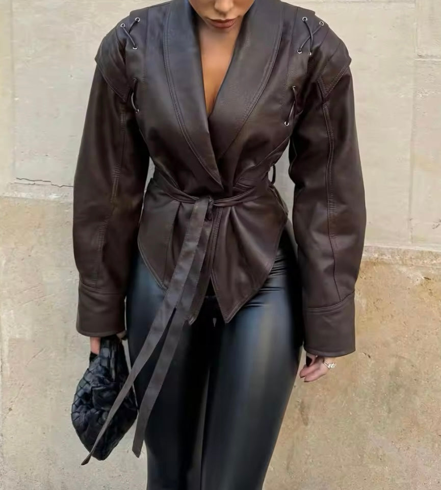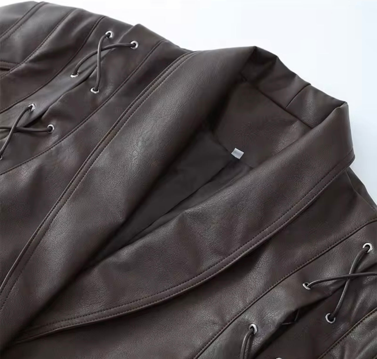 Elevate your autumn wardrobe with our V-Neck Lace-Up Leather Jacket, a perfect blend of edgy style and sophisticated comfort. This jacket features a deep V-neckline and an adjustable lace-up front, allowing for a customizable fit that accentuates your silhouette. The rich, earthy tones make it a versatile piece that pairs effortlessly with both casual and dressier outfits. Oakridge Classic jacket is as functional as it is fashionable.