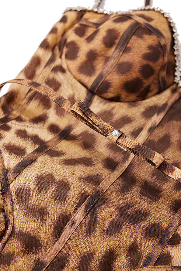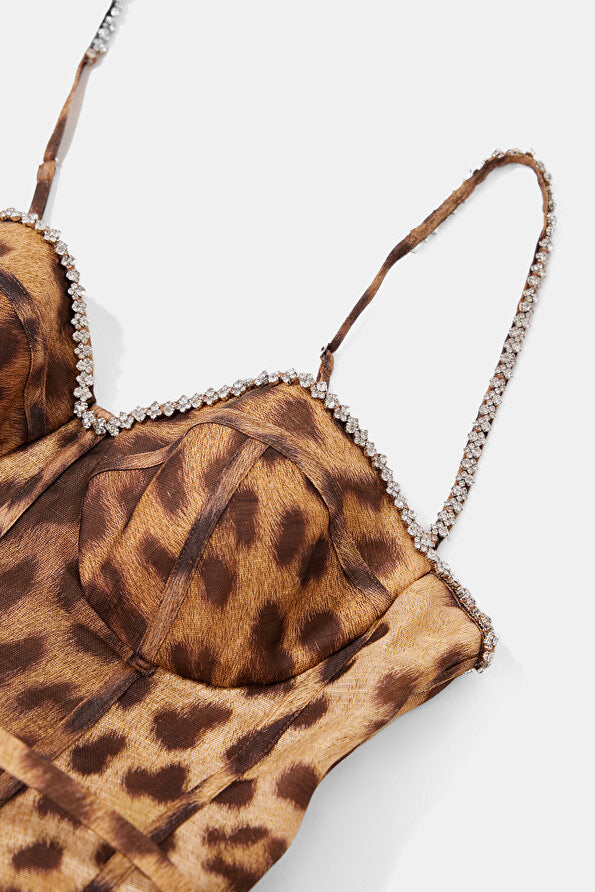 Dieses atemberaubende Leopardenkleid zieht bei jedem besonderen Anlass garantiert alle Blicke auf sich. Der figurbetonte Bustier-Schnitt betont die Silhouette, während die zarten, glänzenden Ketten Träger dem Design einen luxuriösen Akzent verleihen. Die ausgestellte Midi-Länge sorgt für eine glamouröse, zugleich feminine Bewegung und rundet den Look stilvoll ab. Ein echtes Statement-Piece, das den ikonischen Animal Print mit edler Eleganz verbindet ideal für Cocktail Events, festliche Abende oder glamouröse Auftritte.