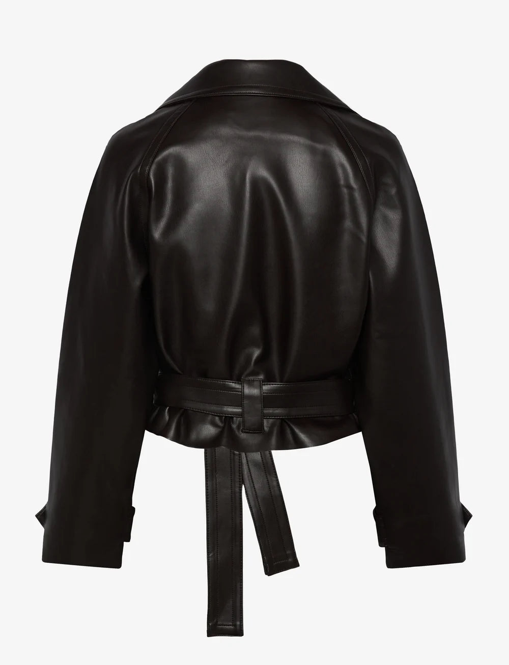 A statement piece with timeless edge. This faux leather jacket comes in a straight cut with a short, modern silhouette. Designed with a crossover front and wide notched lapels, it balances classic tailoring with contemporary flair. The long sleeves feature buttoned cuffs, while two side pockets add practicality. Double rows of buttons emphasize the structured look, and the self-tie belt styled like a robe cinches the waist for a flattering shape. Fully lined for comfort, this jacket is the perfect blend of sharp design and effortless cool. Perfect for the autumn season.