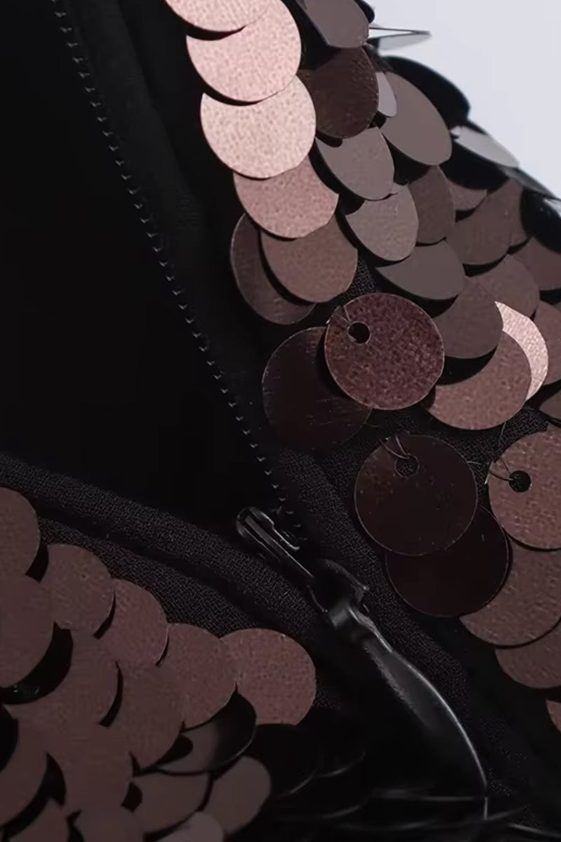 Setzen Sie ein glamouröses Statement mit diesem Midi Rock, komplett mit funkelnden Pailletten besetzt, in einem warmen, satten Braunton. Der Rock besticht durch seine reichhaltige Farbintensität und das durchgehende Schimmern, das jedem Schritt elegante Bewegung verleiht.