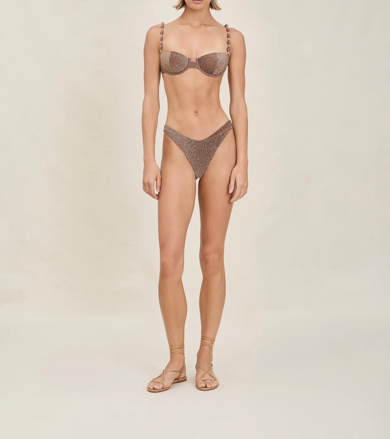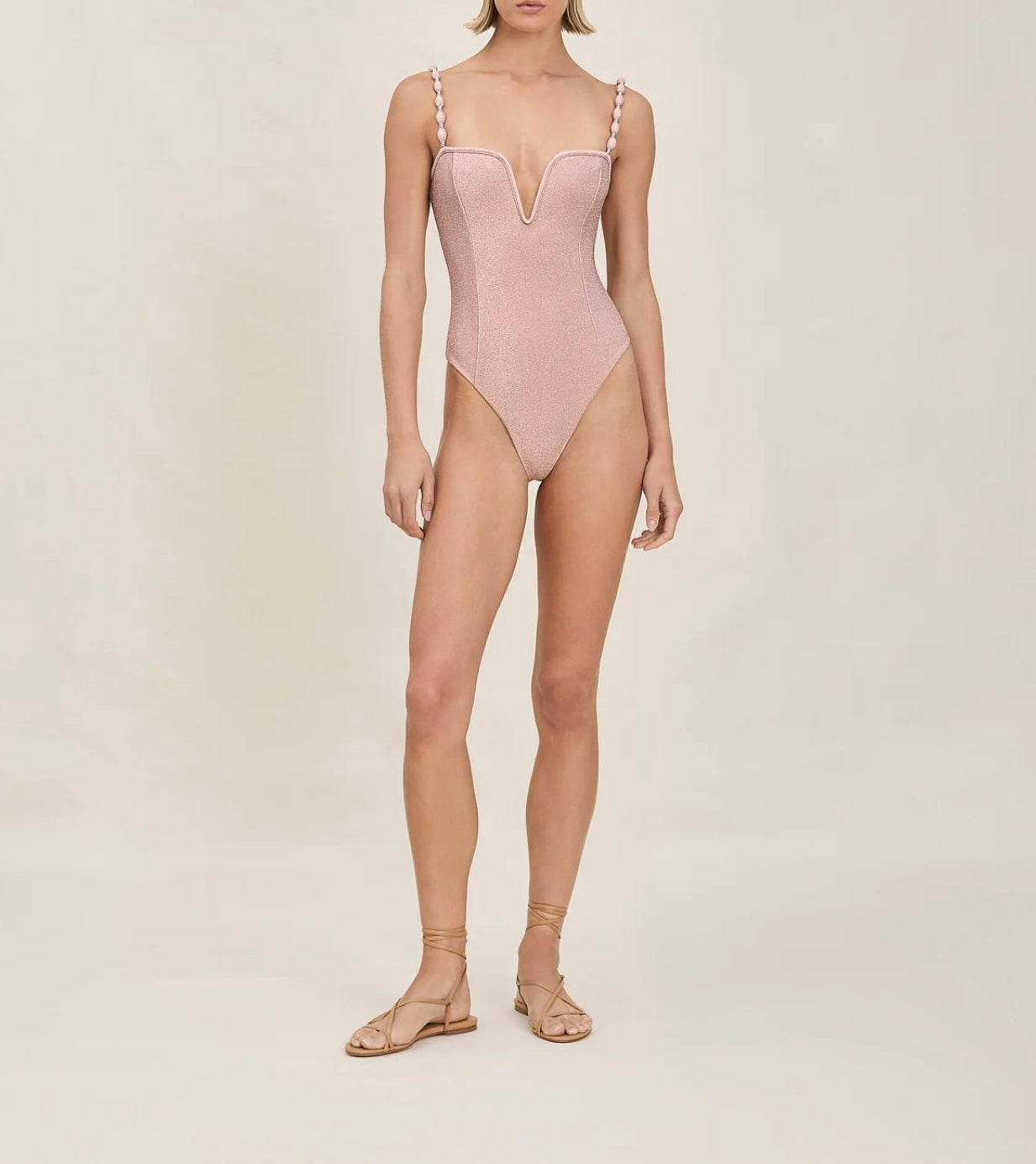 Turn heads in this shimmering swim set, designed to make you feel sculpted, sleek, and sunlit. Choose between a structured V-cut one-piece that snatches the waist and enhances your silhouette, or a flattering bikini with cheeky-coverage bottoms and a perfectly paired top. Delicate beaded detailing along the straps adds an elevated, artisanal touch, while the sparkly fabric catches the sunlight, making you glow from every angle.