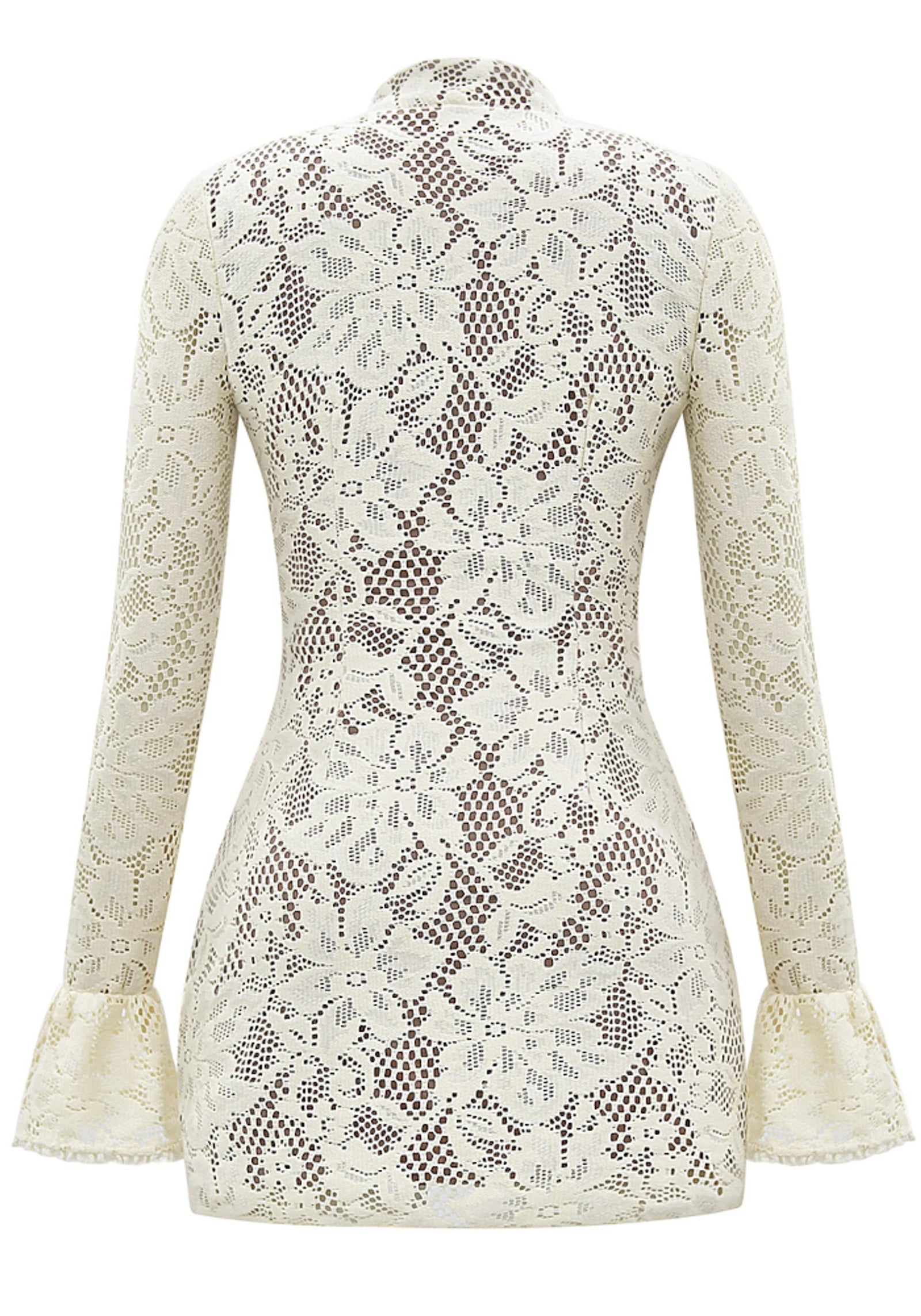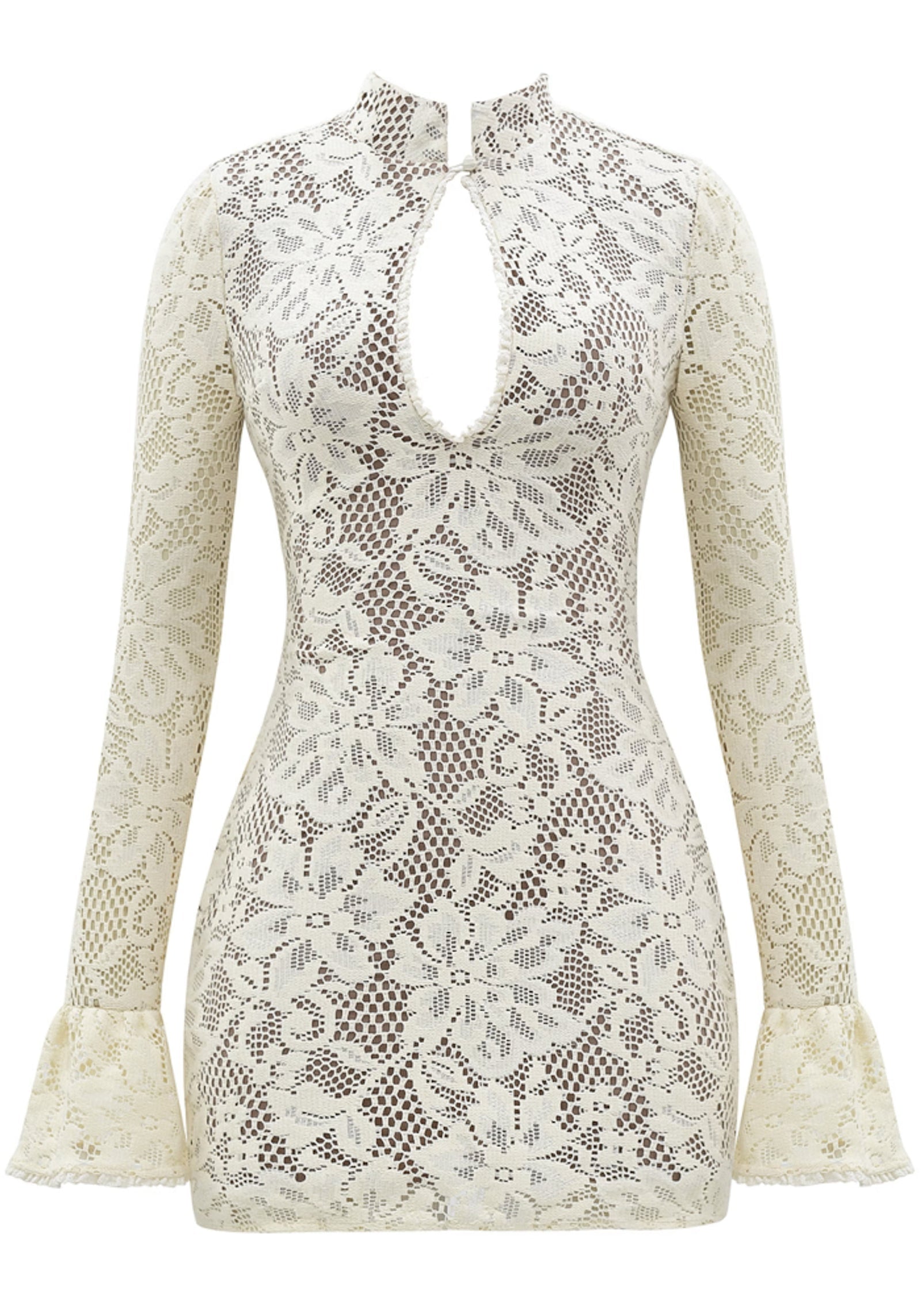 Dieses figurbetonte Bodycon-Kleid besticht durch seine elegante Spitze und zieht garantiert alle Blicke auf sich. Entworfen in Paris mit zeitloser Eleganz, vereint es Raffinesse und modernen Chic auf perfekte Weise. Die 100 % Polyester-Spitze mit floralem Muster verleiht dem Kleid eine edle Textur, während die langen Ärmel mit ausgestellten Manschetten stilvolle Akzente setzen. Die Mini-Länge sorgt für einen optisch verlängernden Effekt der Beine, und die tiefgründige Fütterung garantiert Komfort sowie vollständige Abdeckung. Dieses Kleid das ideale Statement-Piece für besondere Anlässe oder unvergessliche Abende.