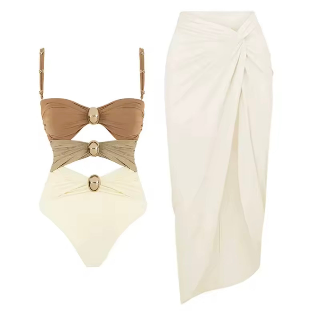 The look is complete with a matching cover-up lightweight, flowing, and made to move with you from sun drenched mornings to golden hour strolls. Available in radiant shades.
