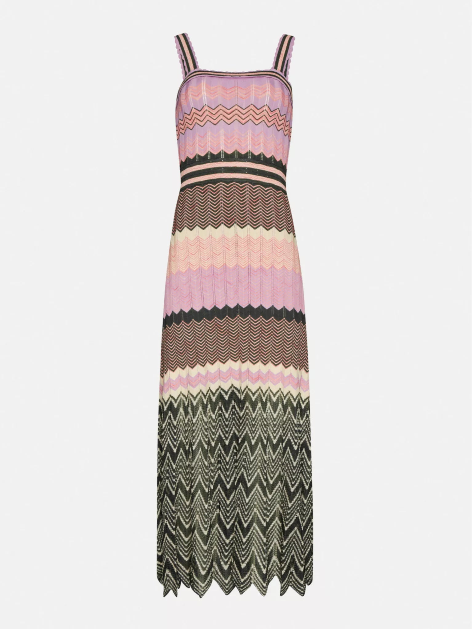 A timeless piece with modern charm, this dress is crafted in a woven chevron pattern that brings texture and depth to your everyday wardrobe. Designed with delicate shoulder straps and a flattering square neckline, it features contrasting panels for a subtle yet striking effect. A zig zag trim at the hem adds a refined finishing touch. Slipping on with ease, Pair it with sandals and a tote for a relaxed daytime look, or elevate it with heels and gold accessories for an elegant evening ensemble.